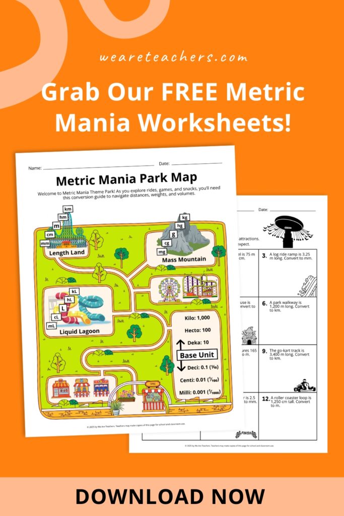 Step right up! At Metric Mania Theme Park, students practice converting metric units through engaging, real-world scenarios that bring math to life. Your students will love exploring the rides, food, and more in these free metric conversion math activities.