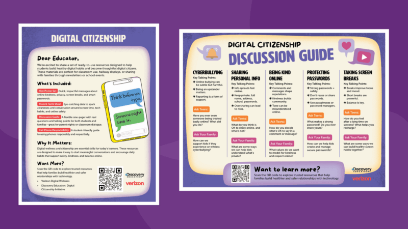 Get four student-friendly posters—they will grab kids’ attention and spark conversation. Each poster delivers a quick, impactful message about essential digital habits like online kindness, protecting privacy, taking screen breaks, and creating smart passwords.
