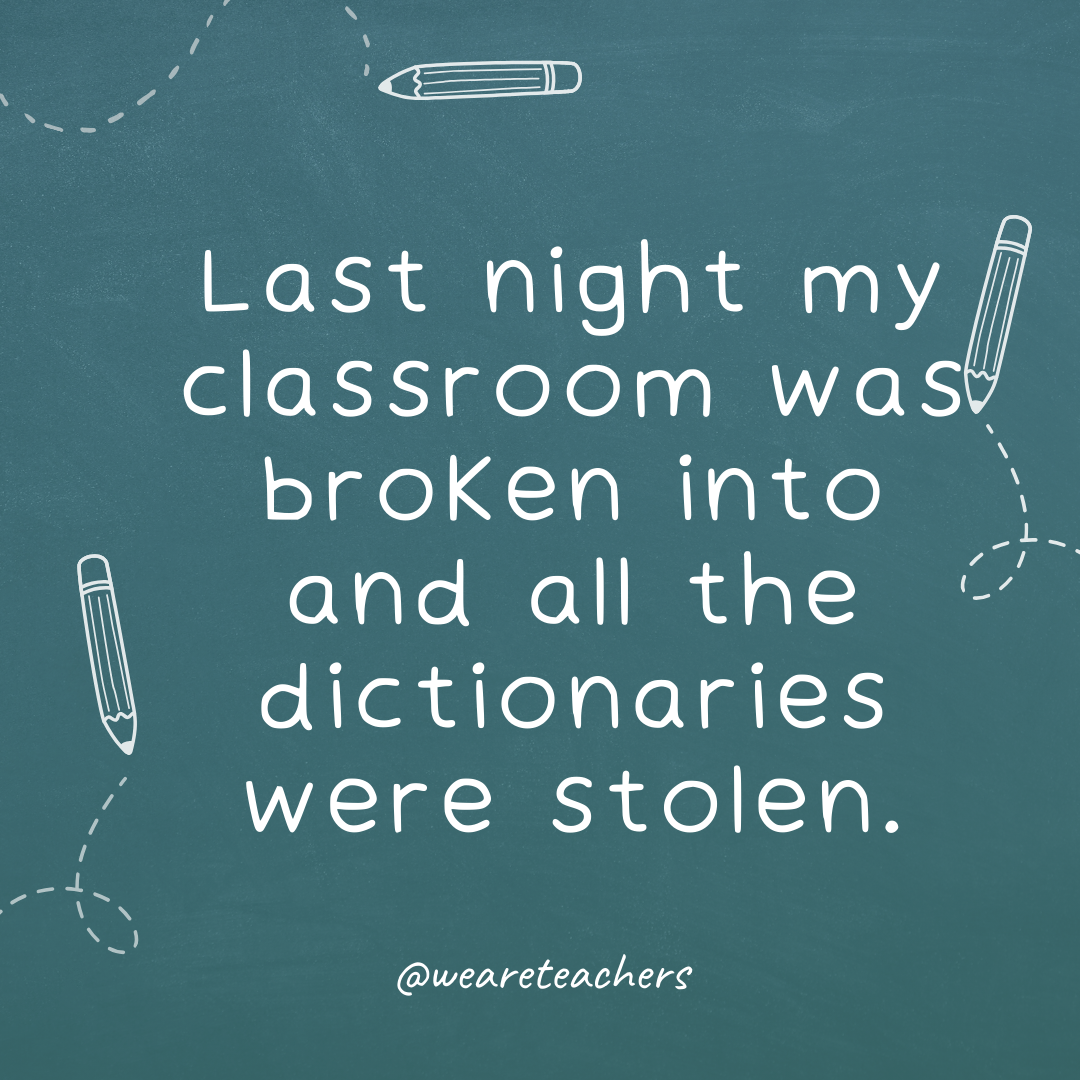 9. Last night, my classroom was broken into and all the dictionaries were stolen.