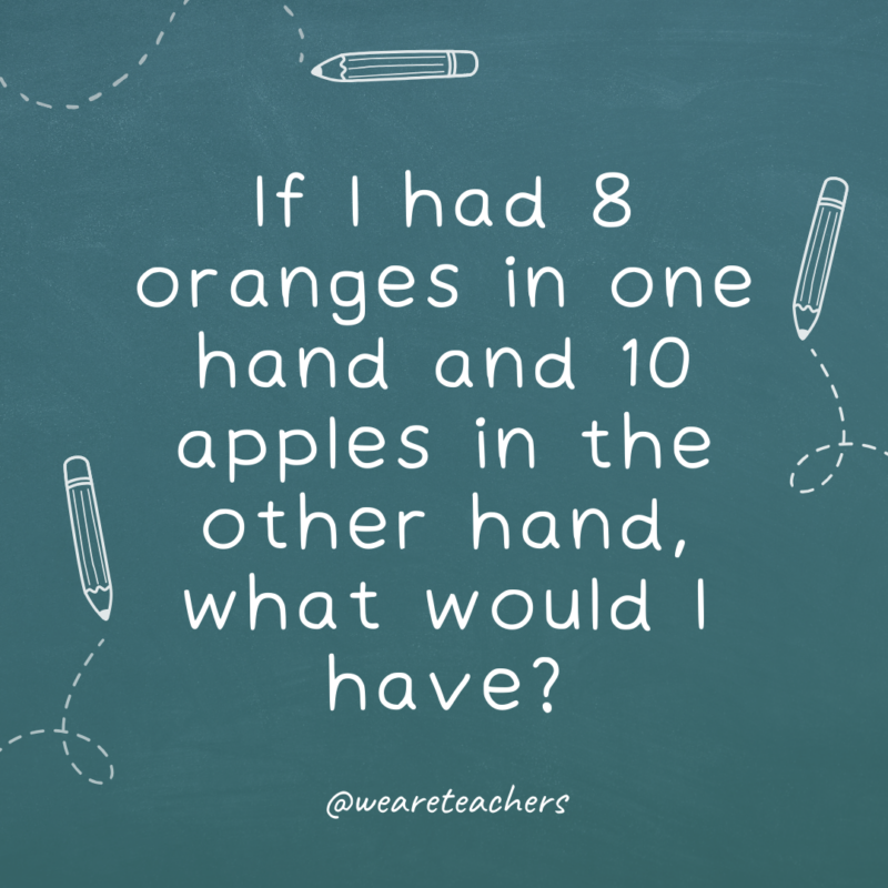 24. If I had 8 oranges in one hand and 10 apples in the other hand, what would I have?