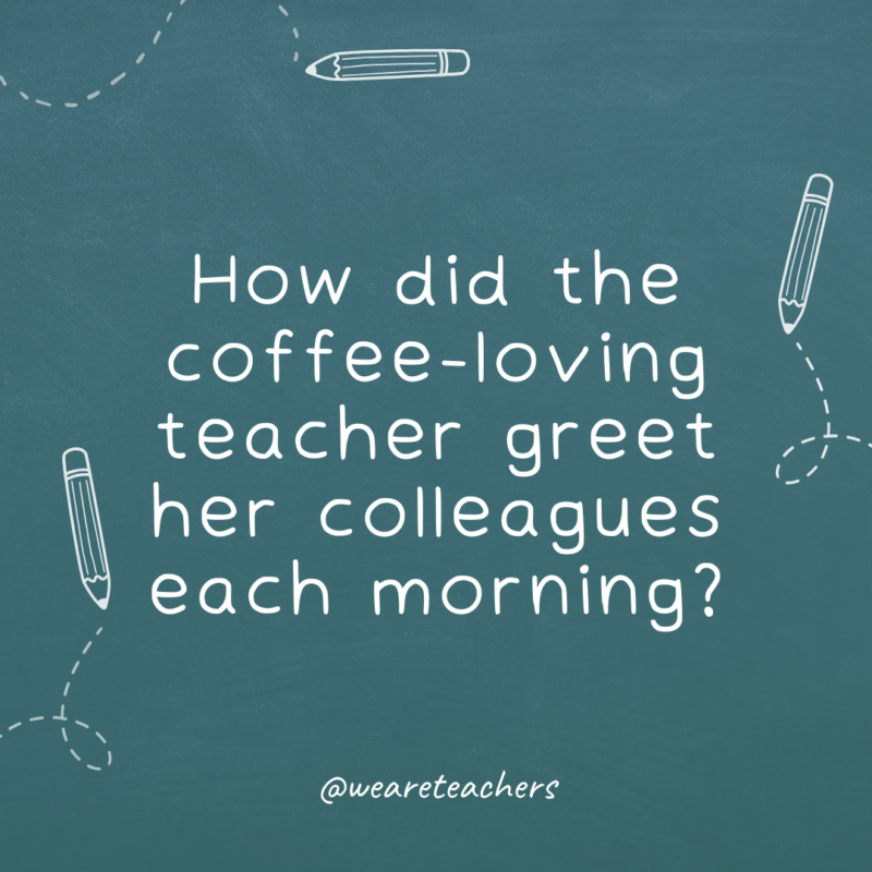 116. How did the coffee-loving teacher greet her colleagues each morning?
