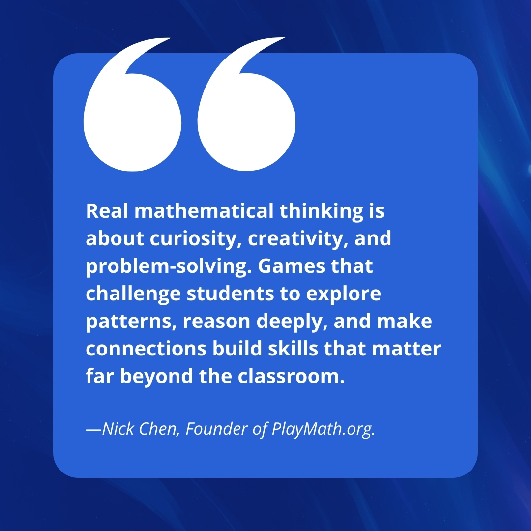 “Most math games today focus on rote memorization like fact fluency and worksheets dressed up as games,” notes Nick Chen, founder of PlayMath.org. “But real mathematical thinking is about curiosity, creativity, and problem-solving. Games that challenge students to explore patterns, reason deeply, and make connections build skills that matter far beyond the classroom.”