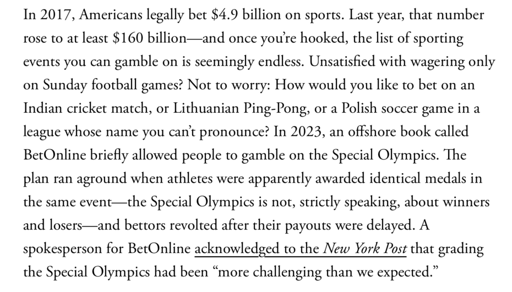 At the same time, the McKay Coppins Atlantic article about his foray into sports betting is rightfully getting a lot of attention and might be a better jumping-off point. The magazine staked Coppins $10k to try sports betting and — well, read it. The short version: the distance from church-going family man to having to use a state’s self-exclusion list to curb a gambling habit is shorter than you might think.