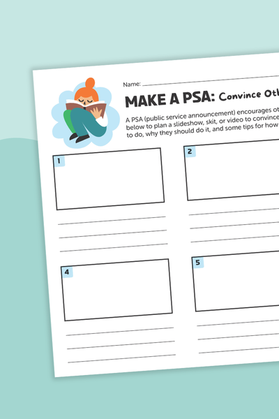This project is a perfect way to start or end your school’s book challenge. Students choose an audience and write a public service announcement about the 500 Billion Page Challenge or reading in general. To finish the project, film or produce the PSA and share it with the intended audience.