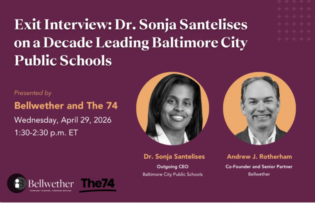 Next week, on April 29th, I’ll talk with Dr. Sonja Santelises, outgoing CEO of Baltimore City Public Schools on her run in Baltimore and what she’s learned. You can join and ask questions. That’s brought to you by Bellwether and The 74.