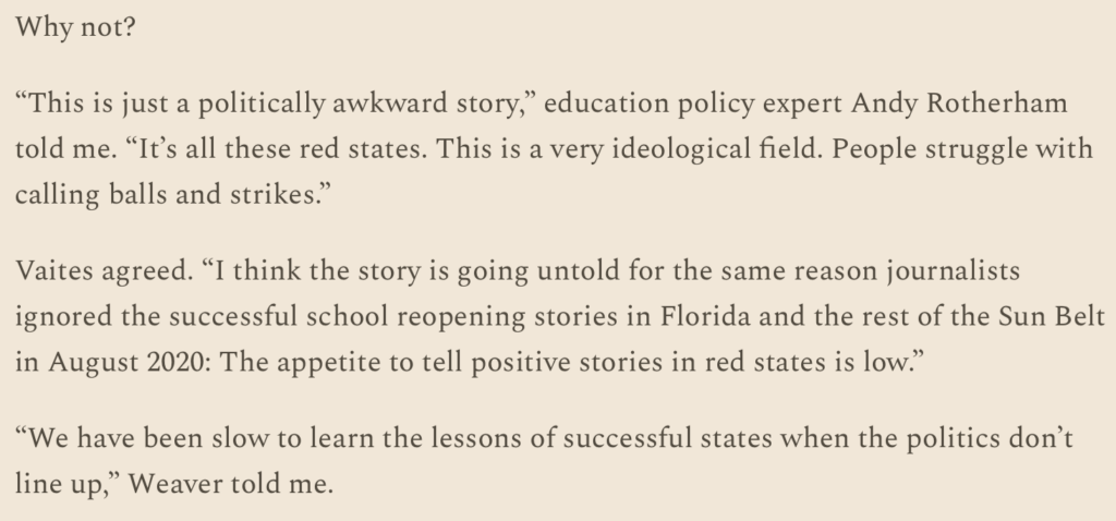 Kelsey Piper notes in The Argument that some of the states making meaningful gains share common strategies around literacy. Why isn’t that catching fire more? I have a hunch: