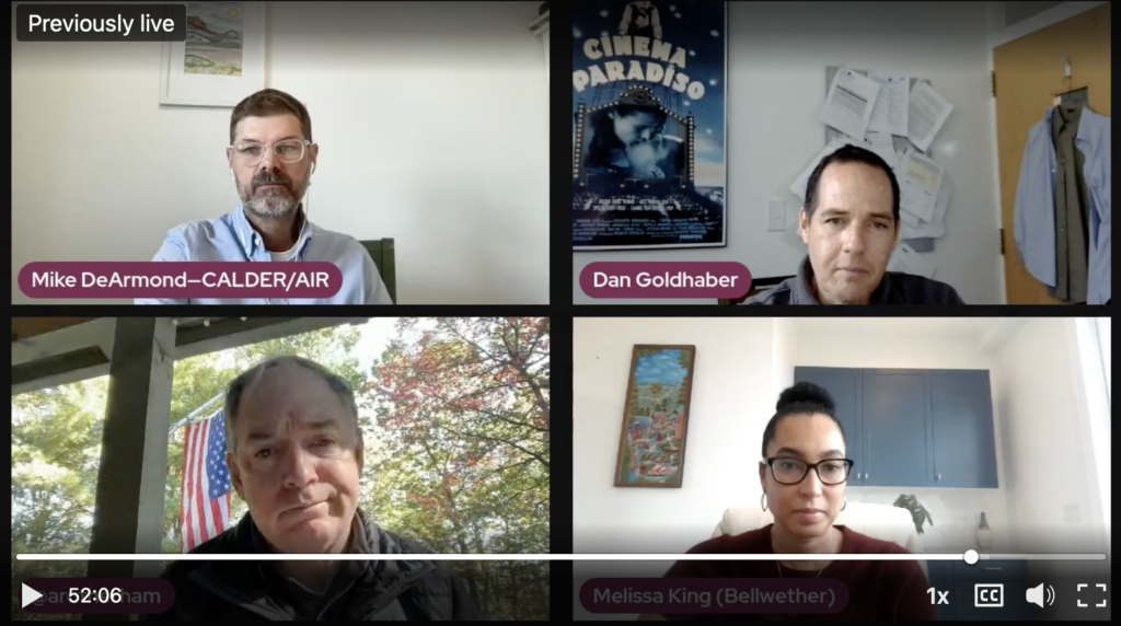 At LinkedIn Dan Goldhaber, Michael DeArmond, Melissa Steele-King and I talk about pandemic research – and our joint BW – Calder Pandemic Learning Project research. Covid disruption created a host of natural experiments as various policies were waived or modified on the fly. We’re trying to learn from that. We discuss all that and more in this conversation.